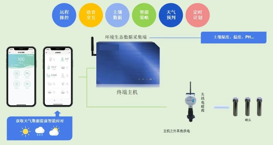 滴翠智能結(jié)合新奧燃?xì)鈱?shí)訓(xùn)基地現(xiàn)狀,制定合理解決方案:1、通過(guò)硬件產(chǎn)品的數(shù)據(jù)調(diào)試和對(duì)接,實(shí)現(xiàn)各項(xiàng)硬件設(shè)施遠(yuǎn)距離無(wú)線互聯(lián);2、根據(jù)噴灑面積配置噴頭,可以均勻地噴水;3、大數(shù)據(jù)云計(jì)算通過(guò)轉(zhuǎn)變?nèi)斯す莛B(yǎng)模式,用智能化設(shè)備解決目前管養(yǎng)瓶頸。結(jié)合基地現(xiàn)場(chǎng)及所在地等環(huán)境監(jiān)測(cè)PM2.5、負(fù)氧離子、植物病蟲(chóng)害、土壤溫濕度等數(shù)據(jù)采集,再通過(guò)云端AI計(jì)算后形成決策,并控制對(duì)應(yīng)灌溉、霧化、撒藥等設(shè)備直接執(zhí)行。全部無(wú)線部署,低成本高效率,實(shí)現(xiàn)完全智能化、無(wú)人化管理養(yǎng)護(hù)。