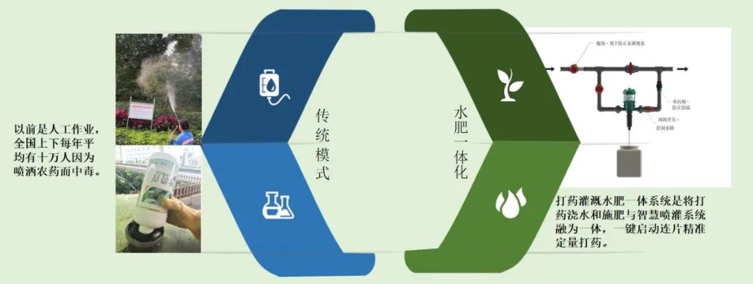 水肥一體系統(tǒng)將打藥、澆水和施肥與智慧噴灌系統(tǒng)融為一體,一鍵啟動(dòng)連片精準(zhǔn)定量打藥,具有省藥、省肥、節(jié)水、省工省力、省時(shí)省電、增產(chǎn)高效的特點(diǎn)。相比傳統(tǒng)人工打藥、大水漫灌,可以節(jié)水30%以上,省肥30%-50%,人工成本降低70%左右,藥、水和肥料利用率可達(dá)90%以上。安裝后基本可將基地綠化養(yǎng)護(hù)工作全部涵蓋。