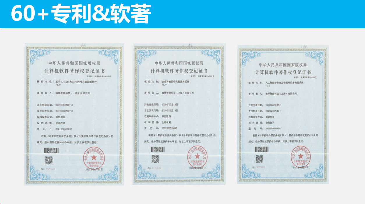 滴翠智能持續(xù)增加研發(fā)資金投入,產(chǎn)品及相關技術目前已獲得60+專利&軟著,公司已獲得國家級高新技術企業(yè)、科技型中小企業(yè)、智慧農(nóng)業(yè)領軍企業(yè)、人社部全國優(yōu)秀創(chuàng)業(yè)創(chuàng)新項目等榮譽和認證。